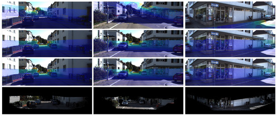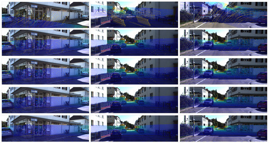 Similarly to LCCNet [15], we employ a multi-range iterative refinement method to improve the calibration accuracy further. We train five models with different initial error ranges, 1.5 m, , 1.0 m, , 0.5 m, , 0.2 m, , and 0.1 m, respectively. The calibration iterative refinement process is shown in Algorithm 1. The inputs are camera frame I, LiDAR point clouds L, camera intrinsic K, and the initial calibration parameters T. After pre-processing the sensor data, we project the LiDAR point clouds L onto the image plane to generate the sparse depth image D and the valid projected 2D points set . Due to the input size of the network being , we need to crop the original RGB image and the depth image simultaneously. To ensure the cropped depth image contains as many points as possible, we calculate the centroid of to get the location of the crop window. Then, we use the output of 1.5 m, to rectify the coordinate of each projected point . The rectified 2D projected points and the corresponding valid LiDAR point clouds construct new 2D–3D correspondences. By applying the EPnP algorithm within the RANSAC scheme, we calculate the extrinsic parameters and set them to . We regard the transformation as a new initial extrinsic parameters to re-project the LiDAR point clouds and generate a depth image, which is taken as the input of 1.0 m, . The number of accurate 2D–3D correspondences in the current iteration is much more than the last iteration in theory. The above process is repeated five times, iteratively improving the extrinsic calibration accuracy. The calibration flows predicted by networks with different initial error ranges are illustrated in Figure 4. The inference time for a single iteration on one NVIDIA TITAN RTX GPU is about 40 ms for the calibration flow prediction and 35 ms for EPnP+RANSAC.