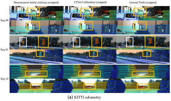 KITTI Odometry datasets. Each sequence in the KITTI Odometry datasets has different extrinsic calibration parameters. Therefore, we evaluated our CFNet on the KITTI Odometry datasest to test whether CFNet works with different extrinsic calibration parameters in various scenes. We selected sequences 00, 01, 08, 12, and 14 from the KITTI Odometry datasets as test data. Sequences 00 and 08 were collected in an urban area, so they include lots of buildings, pedestrians, and vehicles. Sequences 01 and 12 captured images of a highway with many vehicles moving at high speeds. For sequence 14, the data were collected in the city’s suburbs, thereby containing a large amount of vegetation and no buildings and vehicles.