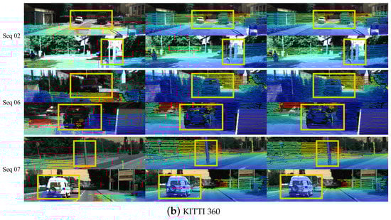 KITTI360 datasets. We also implement the proposed CFNet on KITTI360 datasets. All the sequences in the KITTI360 datasets have the same extrinsic calibration parameters. As shown in Table 7, the deviation in the initial extrinsic parameters is large in the rotation part (). Sequences 0002 and 0006 were captured in urban areas, so they include constructions, pedestrians, and vehicles. Sequence 0007, which only has high-speed moving vehicles and trees, was collected by a highway. It can be noticed that, after training a few epochs with new data, CFNet could accurately estimate extrinsic parameters for a new sensor system. Similarly to the KITTI odometry datasets, the deviations between different sequence lengths are tiny. In Figure 7b, we exhibit some visualized examples of the calibration results predicted by CFNet. The 3D colorized fusion maps generated by predicted extrinsic calibration parameters from CFNet are shown in Figure 8b.
