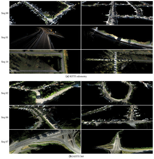 Examples of the reconstructed 3D colorized maps created by fusing the data of LiDAR and camera from the KITTI odometry and KITTI 360 datasets. The extrinsic parameters were provided by CFNet, with the initial parameters from measurements.