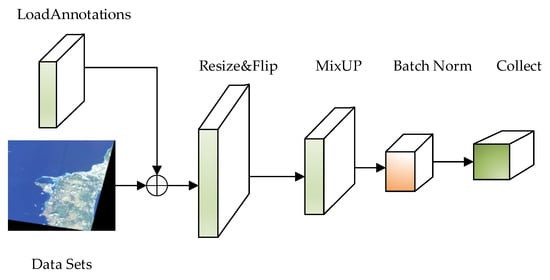 As shown in Figure 2, this process loads the data set and label file, randomly flips the image, and incorporates the MixUp algorithm to mix and enhance the data between different classes, thereby expanding the training data set, improving the generalization ability of the data, and enhancing image feature information. Finally, the image size will be readjusted, and the processed data will be input into the backbone network for learning through a series of process operations such as normalization and collection.