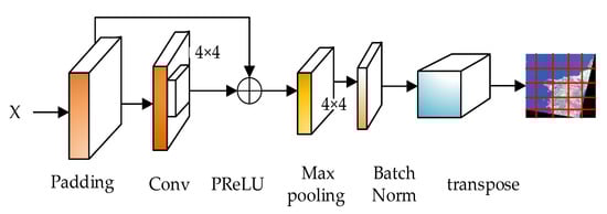 As shown in Figure 3, after the high resolution remote sensing satellite image is input, the large resolution image is segmented, and the convolution kernel and the convolution with a step size of 4 × 4 are performed on the original features, so that there will be no information fusion between different pixel blocks; that is, encode the pixel block, and then use the PReLU function to activate the non-linear transformation of the convolved feature map. After the transformation, the feature information is subjected to a max pooling, and the pooled feature information is normalized, in dim = 2 and dim tile the tensor on the dimension = 3, and then transpose the last two dimensions to form the final segmented feature map output.
