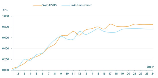 From the curve trend in Figure 4, it can be found that the average precision of the Swin-HSTPS in batches 1 to 12 has a faster growth, an approximate linear increase, and the fluctuation is small. Compared with the Swin Transformer, the average precision is close. At the same time, the average precision of the Swin-HSTPS in batches 13 to 24 is higher than that of the Swin Transformer. After the peak of 0.853 in batch 17, the average precision has been maintained at around 0.85. The Swin-HSTPS has better convergence than the Swin Transformer. The Swin-HSTPS model average precision is higher than the Swin Transformer model and the number of batches reaches 18 batches, and at the same time, the Swin-HSTPS has exceeded the Swin Transformer’s highest average precision value of 0.768 in batch 15 and batch 14 of the Swin-HSTPS, indicating that the Swin-HSTPS has been able to obtain average precision exceeding the Swin Transformer in batch 15 training; the Swin-HSTPS model can reach higher AP with fewer training rounds. This shows that the Swin-HSTPS has a better learning rate than the Swin Transformer training, and the overall training process can inherit or exceed the training efficiency of the Swin-HSTPS.