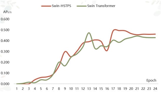 (2) The Swin-HSTPS and Swin Transformer target detection model training 24 batches of IoU average precision of 0.75 for comparison, as shown in Figure 5.