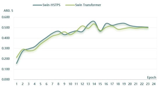 From the curve trend in Figure 5, it can be found that the average precision of the Swin-HSTPS in batches one to nine has a faster growth, an approximate linear increase, and a small fluctuation. Compared with the Swin Transformer, the stability is stronger, and the average precision is slightly higher overall. At the same time, in addition to the 16 batches, the average precision of the Swin-HSTPS in batches 14 to 24 is basically higher than that of the Swin Transformer, and the average precision has been maintained at about 0.46 after reaching the highest point of 0.493 in batch 17. Compared with the Swin Transformer, the average precision of the Swin-HSTPS has exceeded 0.4. It was maintained at around 0.46, and the stability is better. The Swin-HSTPS model average precision is higher than the Swin Transformer model and the number of batches reaches 18 batches, indicating that the Swin-HSTPS has a better learning rate than the Swin transformer training, and the overall training process can inherit or exceed the training efficiency of the Swin-HSTPS.