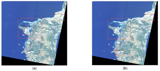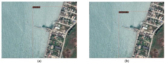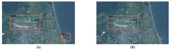 (2) The Swin-HSTPS and the Swin Transformer predict the accuracy of markers and make a relevant comparison. From Figure 10, it can be seen that the Swin Transformer incorrectly marked the port at the bottom of the image, and the Swin-HSTPS has a multi-level prediction of the port on the far left. It can be seen from Figure 11 that the Swin-HSTPS has marked one more port buildings than the Swin Transformer, and the Swin Transformer has missed the mark. The comparative analysis of the two sets of images shows that the Swin-HSTPS has a higher ability to predict and recognize buildings than the Swin Transformer. In addition, Figure 10 and Figure 11 both predict multiple types of target buildings. From the comparison of the accuracy of the prediction results, the Swin-HSTPS model has a better recognition accuracy than the Swin Transformer. It can basically find high-resolution remote sensing image traffic port station targets, reduce model recognition errors, and improve its positioning ability.