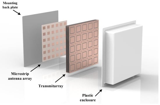 The antenna design being proposed in this paper is depicted in Figure 1. The antenna is composed of three main parts: (i) a microstrip patch antenna array operating as a feeding source; (ii) a transmitarray structure to control the wave front direction and thus, enable beamsteering and, finally (iii) a plastic enclosure to cover all electronic parts and provide a clean design and application. Each part is thoroughly detailed in this section.