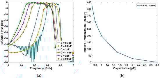 According to simulations, the proposed transmitarray element configuration exhibits an effective bandwidth of 100 MHz centred at 3.6 GHz (Figure 3a), defined by the maximum and minimum cut-off frequency of the lower and higher capacitor values, respectively. The global insertion loss is better than 4 dB, for every filtering configuration within the unit-cell bandwidth. Moreover, the relative transmission phase-shift is of , within the capacitance sweep range (defined from 0.7 to 2.8 pF), respecting therefore the minimum requirement of to obtain full control of the beamsteering, as reported in [23].