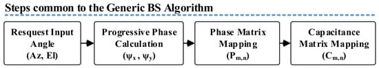 In a practical implementation with a transmitarray, such local phase-delay () is, then given by unitary transmission phase, i.e., the phase difference between the incoming and outgoing wave in each array element. This is in turn function of the capacitors values loaded into each unit-cell, as demonstrated in Section 2. Therefore, for each beamsteering output angle, given by the pair (Az,El), will correspond a different capacitance matrix, herein represented by (3). For the sake of simplification, Figure 4 demonstrates the workflow for the computation of the capacitance matrices for a required output angle.