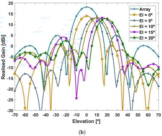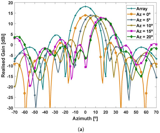 According to the simulations results of Figure 5, the antenna presents a maximum gain of 13.9 dBi when at boresight (, ), against 18 dBi achieved with the microstrip array alone, which reflects the 4 dB of insertion loss caused by the transmitarray. Moreover, it is possible to observe that the antenna has the capability of performing beamsteering in a range defined and , in both azimuth (Figure 5a) and elevation planes (Figure 5b), without major deformation of the original main lobe. Although simulations are only presented for an angular sweep in the positive part of the axis, the antenna presents a good symmetry around the Y-axis in both antenna planes, with a maximum achievable angle of . Within the presented steering range, the maximum gain only decays of around 3 dB. For larger values, relatively high side lobes, with side lobe levels >7 dB start to appear.