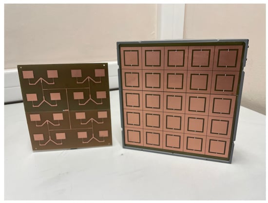 To validate the beamsteering capabilities of the proposed antenna configuration, the microstrip antenna array and the transmitarray have been prototyped, tested and experimentally characterised. Figure 6 depicts the prototype of both antenna and transmitarray models. In order to reduce the manufacturing time and the total implementation cost, both the transmitarray and the microstrip feeding antenna were produced in house, using the available FR4 substrate (, and substrate thickness 1.6 mm), instead of Nelco substrate considered in the initial simulations of Section 2. Such alteration came at the expense of reducing the overall antenna performance due to the poor EM properties (in particular, high loss tangent) of the FR4, specially at microwave frequencies.