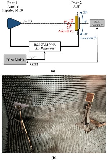 Particularly, the radiation patterns were obtained with the acquisition of the -parameter, per angular step, using the setup depicted in Figure 7. At the transmitter end, a well characterised Aaronia Hyperlog 60100 antenna connected to Port1 of the VNA and kept fixed throughout the measurements, was used. At the receiver end, a well characterised Aaronia Hyperlog 30100 antenna, connected to Port 2 was used as reference (latter replaced by the antenna under test (AUT)). Both antennas were located 2.5 m apart to ensure that the measurements are performed in the far-field region.