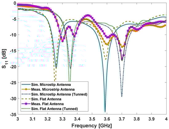 When the transmitarray, with all the capacitors set at 1.2 pF (case study (i)), is placed in the vicinity of the feeding antenna, the remains almost unaltered, despite a slight reduction in the bandwidth to 80 MHz, according to simulations. However, when comparing the simulated results with the ones obtained from experiments, an up-shift of 105 MHz in the entire curves is noticed and, a resonating peak can be observed at 3.7 GHz, with a bandwidth of approximately 75 MHz, corresponding the effective bandwidth of the transmitarray. This offset between experimental and simulation result has been further studied and found to be associated with substrate permittivity of the FR4, which has been considered to be 4.7 in the antenna/transmitarray design stage, respecting the available manufacturer data (1 MHz [27]). After a parametric study in CST MWS, an was found to provide a better match between the simulated and experimental -parameter, as depicted in Figure 8. As this finding was only noticed after the analysis of the measurements results, and for the sake of the evaluation, beamsteering capabilities of the flat antenna design are therefore characterised at 3.6 GHz for simulations, but at 3.7 GHz for experiments.