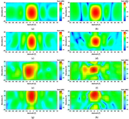 Simulated and measured 3D radiation patterns for: (a,b) microstrip array and; transmitarray set to steer towards: (c,d) and , (e,f) and and (g,h) and .