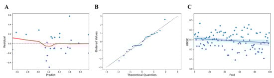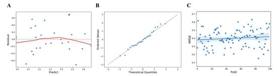 (A) Comparison of predicted values and residuals for health checkup parameters (blue dots, standardized residual; red line, fitted line). (B) QQ plot of residuals for hematology items (blue dots, data set; linear line, standard normal distribution). (C) RMSE distribution and deviation for health checkup parameters (blue dots, predicted value; blue line, Fitted values; blue area, 95% confidence limits).