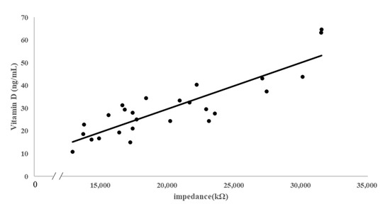 Recently, following the development of smart phones and wearable devices, a method facilitating easy assessment of vitamin D level was developed. It utilizes a smartphone accessory, a mobile app, and a test strip that enables the colorimetric detection of vitamin D using a novel gold nanoparticle-based immunoassay [18], developed through lab-on-a-chip technology. This analytical method, however, does not replace the existing blood analysis. Along similar lines, an easier and more efficient non-invasive analytical method based on a simple score (a vitamin D deficiency predictive score) to identify adults at risk for vitamin D deficiency could not replace blood tests either [12]. This method has reliability concerns with respect to quantification, since its assessment of the user’s behavior and body characteristics using a questionnaire simply informs the level of risk involved. Therefore, a scientifically quantifiable and non-invasive method is necessary for measuring vitamin D levels. There are studies that have confirmed the relationship between vitamin D and impedance using mice [13], but there are no studies on humans.