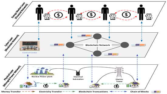 Figure 1 represents an example of the architecture of blockchain-enabled energy trading in microgrid. The architecture consists of three layers. The physical layer represents the physical microgrid infrastructure, including energy generation, network communication, and distribution. Houses with PV panels on top of the house or small wind turbines are considered sources of renewable energy. The generated energy from RES is consumed in the house and the surplus energy is stored in a central buffer energy storage and can be sold to neighbors who suffer from an energy shortage. The cyber layer consists of the blockchain network that is responsible for managing energy flows, data exchange, and financial transaction flows. Furthermore, it contains the energy system control center. The financial network represented in the energy market layer includes consumers and producers who bid for energy trading via the control of a cyber layer where money or digital/virtual currencies are transferred from energy buyers to sellers. The cyber layer affords a facility of participation for microgrid entities in an energy market and fosters the interaction between market and physical layers. Furthermore, it executes the energy and financial transactions created in the market layer.