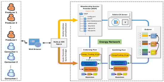- Energy Management System (EMS): The EMS represented by the energy market, which is the interface between energy sellers and buyers, controls energy trading, performs energy allocation, calculates energy price, controls access to energy assets, monitors participants’ behaviors, and secures transactions. The EMS implementation is utilizing HF security, privacy, and performance features.