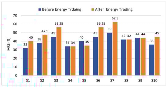 To promote market reliability and trust between sellers and buyers, the concept of MRS is adopted. The MRS indicates the trustfulness of the seller in the energy market. The MRS is a value that started from 0 to 100, where 100 or close represents the good reputation and trust of the seller, while 0 or close represents the bad reputation and trustlessness of the seller. If has MRS less than reputation threshold , their asks will be rejected by the market because of the bad reputation. The value equals 30. With the seller’s first market participation on the day, an initial MRS in a range from 30 to 50 will be assigned to the seller. This initial MRS score will be recalculated at the end of each time slot after selling energy to the buyer according to Equation (7).