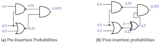 An example of this is illustrated in Figure 5. Figure 5a shows a sample circuit with each node annotated with the probability of that node being a logic 1. The output shown is heavily biased toward logic 0, which makes it more susceptible to SAT attacks. Strategically adding a key gate, as shown in Figure 5b, brings the output probability closer to 0.5, reducing the effectiveness of the SAT attack.
