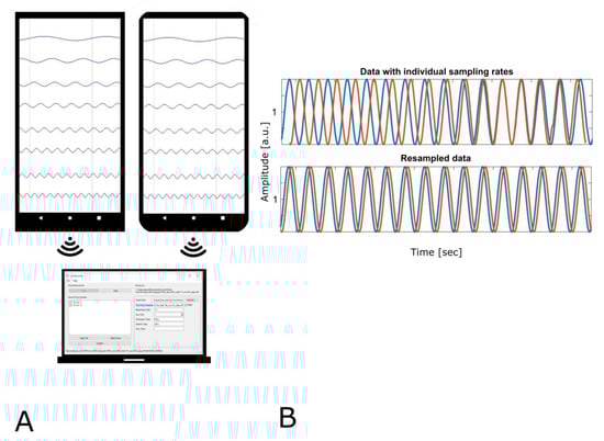 Figure 1 show the setup on the left side of the figure. The right side shows two exemplary channels from the sine data. For the plot, data were imported without jitter handling and sampling rates between phones varied by 10 Hz. This deviation is shown here as diverging alignment between streams from phone one (blue line) and phone two (orange line). The streams briefly align and then diverge due to sampling rate differences. In the lower plot, both data streams were effectively resampled to a common sampling rate by plotting them on the same time scale.