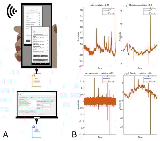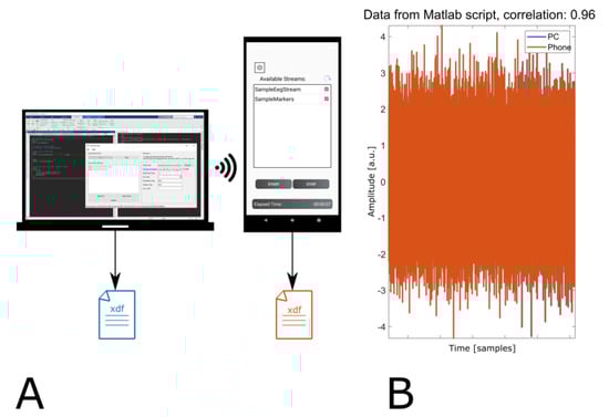 For this purpose, the Lab Streaming Layer (LSL) has gained popularity in the field of multi-modal data recording in recent years [,,]. LSL (RRID:SCR 017631, https://github.com/sccn/labstreaminglayer (accessed on 16 November 2021)) is an open framework consisting of a core library and interfaces for many common programming languages, thus enabling the usage of LSL on a wide range of devices. It uses standard network protocols to send and receive data streams over the local network. All LSL data streams are available with initial synchronized clocks and known drift behavior between devices over time. By default, clock synchronization is performed every 5 s and data from different sensor streams are stored along with all information needed for time synchronization, using a well-defined, standardized file format (extensible data format, xdf, https://github.com/sccn/xdf, accessed on 1 October 2021). For recording LSL data on desktop systems, the LabRecorder software (https://github.com/labstreaminglayer/App-LabRecorder, accessed on 1 October 2021) was developed a few years back, but no versatile, open-source LSL recording application for mobile devices has been published yet. This necessity to use stationary desktop devices has hindered mobile and ambulatory research.