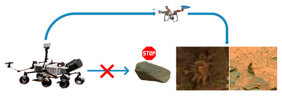 - Mars unmanned vehicle system. Due to the restriction of the harsh environment of Mars, the Mars unmanned ground vehicle is unable to reach the designated position. Therefore, the Mars unmanned vehicle system is conceived. The Mars unmanned vehicle system is composed of two parts: the Mars unmanned ground vehicle and the Mars unmanned aerial vehicle. The Mars unmanned vehicle system is equipped with artificial intelligence algorithms. The schematic of the Mars unmanned vehicle system is shown in Figure 1. When the Mars unmanned ground vehicle encounters obstacles, it cannot pass through them, thus failing to move forward. At this time, the Mars unmanned vehicle system launches the Mars unmanned aerial vehicle to bypass obstacles and discover interesting objects.