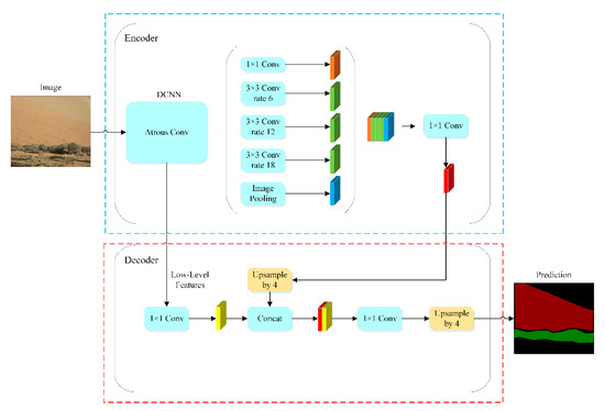 Compared with PSPnet (Pyramid Scene Parsing Network) [20], FCNnet (Fully Convolutional Network) [21], and Unet [22], the advantage of the DeepLabV3+ network is that it uses hole convolution, which enlarges the receptive field of feature information without a loss of information. On Mars, feature information is extremely critical. In order to allow the DeepLabV3+ network to obtain as much feature information as possible, spatial pyramid pooling [23] is used to achieve multi-scale feature information extraction. Low-level feature information is fused with high-level feature information to restore the key information of the target image.