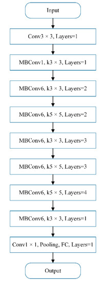 The network structure is divided into nine stages in total. The first stage is a normal convolutional layer (including activation function) with a convolution kernel size of 3 × 3. Stage 2~Stage 8 are all repeatedly stacking MBConv (Mobilenet Convolution) structures (the layers in the last column indicate how many times the stage repeats). Stage 9 consists of a common 1 × 1 convolutional layer (including activation function), an average pooling layer, and a fully connected layer. Each MBConv in Figure 5 is followed by a number 1 or 6, where 1 or 6 is the magnification factor.