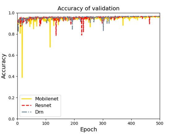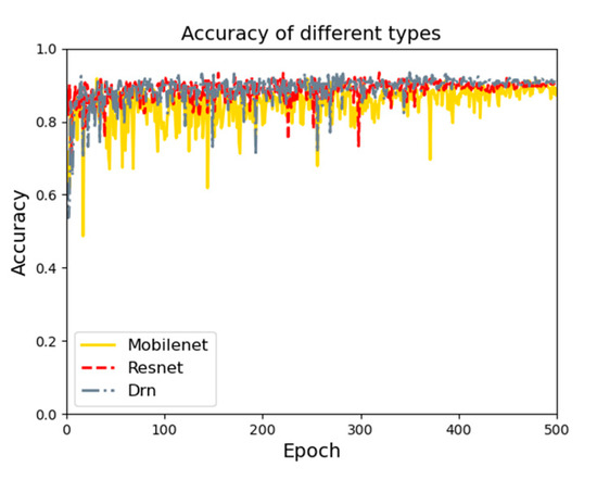 Three base networks are used for feature extraction. Figure 9 shows the feature extraction accuracy curve diagrams using three base networks. On the test set, three base networks are compared, and the Drn base network works best. The accuracy on the test set is 97.3%.