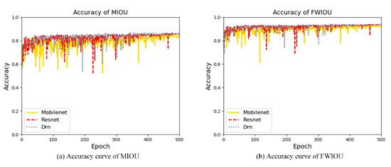 In feature extraction, there are some other indicators, such as MIOU (Mean Intersection Over Union) and FWIOU (Frequency Weighted Intersection Over Union). MIOU represents the ratio of intersection and union of predicted values. FWIOU stands for setting the weight according to the frequency of occurrence of each category. The accuracy of MIOU and FWIOU is shown in Figure 11a,b, respectively.