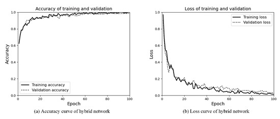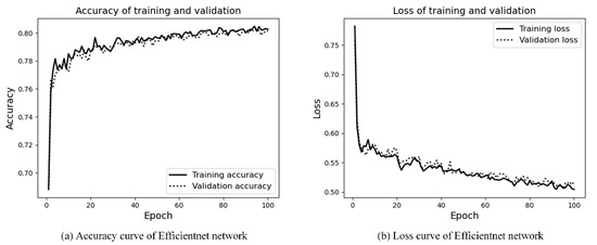 The Efficientnet network is only used to judge the scene area. The experimental results are shown in Figure 14a,b. It can be seen that the number of training rounds is 100 epochs, the network converges quickly, and the accuracy of the training and validation is in good agreement. The trained model is performed on the test set, with an accuracy of 81% and a loss value of 0.51. Experimental results show that, compared with the Efficientnet network, the hybrid network is more effective.