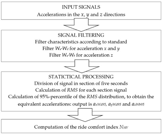 where T = 5 s and t is a multiple of 5 s. Modified values of accelerations are statistically evaluated in the corresponding directions and a summation function is determined. Finally, 95%-percentiles of the distribution function in 5 s intervals are estimated from histograms. The calculation process of the ride comfort index NMV is depicted in Figure 2.