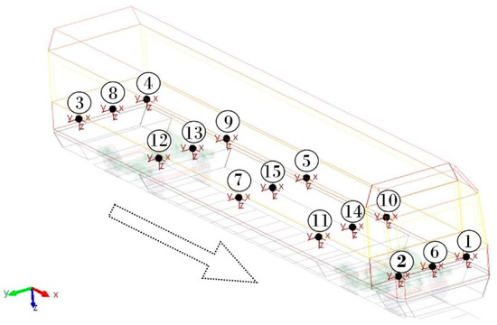 As the main criterion, the level of ride comfort for passengers of a railway passenger car is evaluated based on the values of the ride comfort indices. Acceleration signals in three directions, x, y and z, are the main inputs for their calculation. Fifteen locations are chosen on the car body floor from which acceleration signals are measured. These points are shown in Figure 3.