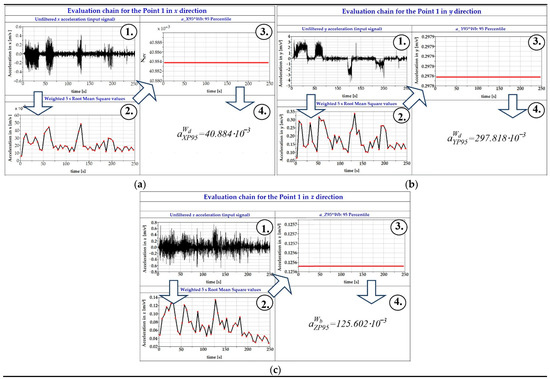 The procedure of processing acceleration signals in the Simpack software postprocessor: (a) for the x direction; (b) for the y direction; (c) for the z direction.