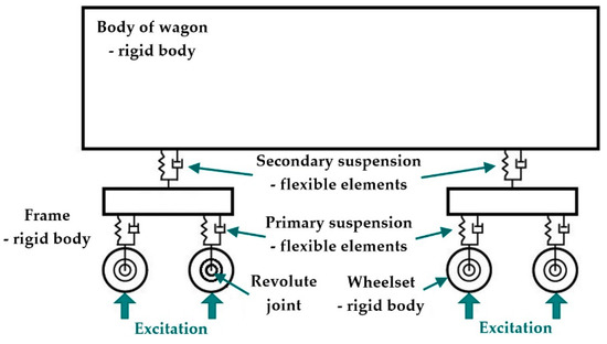 In terms of the computational model, the created wagon model is composed of rigid bodies which are connected by massless spring-damper elements. An illustration of the multibody wagon model is shown in Figure 6.