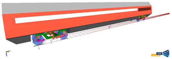 The current state of simulation computations allows precise estimations and predictions of the dynamic properties of a vehicle in real operational conditions [15,16,17,18,19,20,21]. It is important to set up a virtual model with characteristics representing real states as accurately as possible. In the simulation software, the multibody system of the railway passenger car consists of rigid bodies interconnected by spring-damping elements [22,23]. The analyzed model of a vehicle includes the set of acceleration sensors, i.e., accelerometers, which measure the acceleration of the vehicle body in all three directions [24]. These acceleration signals are essential when calculating the ride comfort indices, based on which the ride comfort for passengers is assessed [25,26,27].