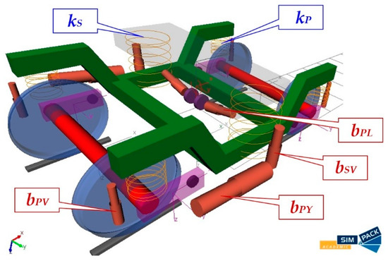 The bogie of the wagon with marked individual components of the primary and secondary suspension system is depicted in Figure 7.