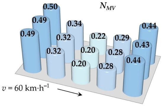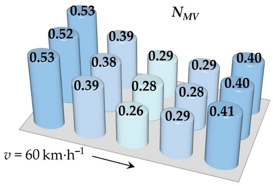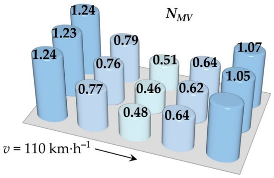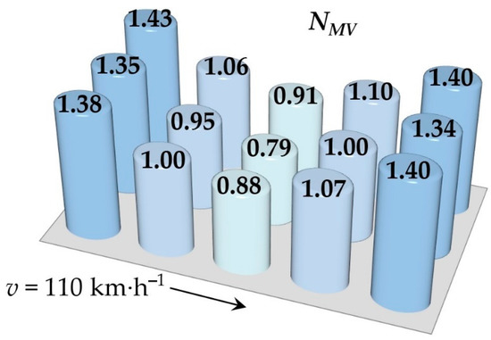 Figure 9, Figure 10, Figure 11, Figure 12, Figure 13 and Figure 14 show the distribution of the ride comfort index NMV on the wagon body floor for various running conditions. These histograms are arranged according to the scheme shown in Figure 3.