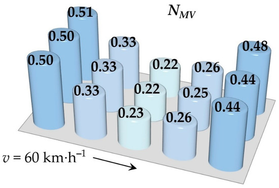 The distribution of the index NMV for a speed of 60 km∙h−1: the “Modification II” parameters.