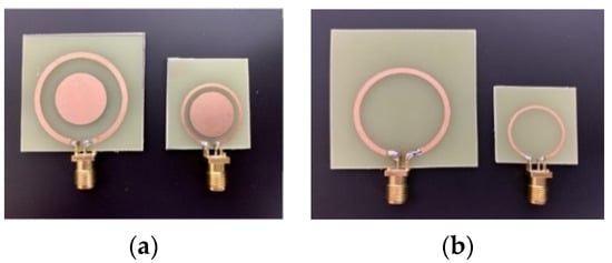 Photographs of the (a) tuned resonate couplers with a center pad and (b) single loops without the pad.