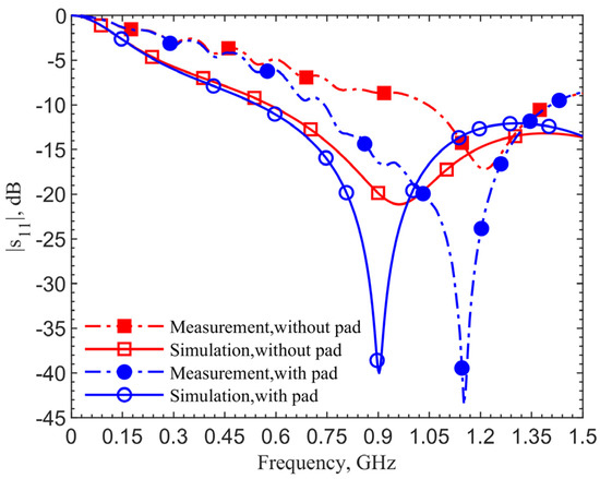 Because it is impossible to use human tissues for experiments, ground pork with about 27% of fat and 0.013 moles of saline is used as the tissue material at room temperature. The pork is packed in a cube of 100 × 100 × 50 cm3 as a phantom. The cube is sealed with multiple layers of plastic wrap to keep moist. Disagreements on the tissue dielectric characteristics (permittivity and conductivity) are expected. Verification for the discrepancies affected by this factor will be conducted later. Both the simulations and measurements are conducted up to 3 GHz, covering the two desired ISM bands. Photos of the devices with and without the pad are shown in Figure 3. Measurements are conducted with a PNA N5227B vector network analyzer (Keysight).