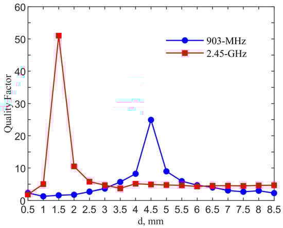 Figure 6 shows the qualify factor comparison for the designs in two ISM bands. The quality factor is calculated from / where is the resonant frequency and is the 3-dB bandwidth. The quality factors reach maximum values of 24.91 and 51 with d = 4.5 and 1.5 mm for the 903-MHz and 2.45-GHz designs, as compared to those of 2.12 and 4.80 for their counter-parts of the single loop designs without a pad.