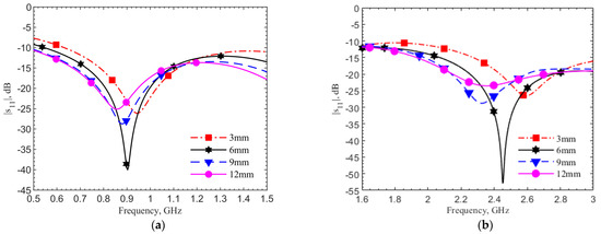 Simulations of the reflection coefficient for (a) the 903-MHz and (b) 2.45-GHz designs with tuning pad in the depths of 3, 6, 9 and 12 mm. The simulations are conducted with human skin properties, reprinted with permission from [29]. Copyright 1997 Institute of Applied Physics.