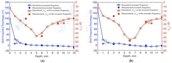 Frequency shift percentage (left y-axis) and s11 magnitude (right y-axis) in the depth of 0–12 mm for the (a) 903-MHz and (b) 2.45-GHz designs with tuning pad. Measurements in discrete depths of 3, 6, 9 and 12 mm are compared with simulation results obtained at 1-mm steps.