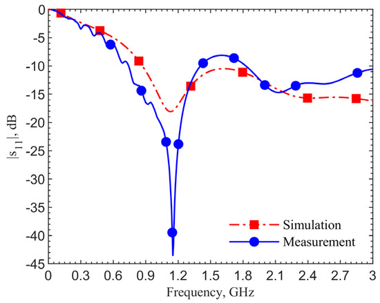 To validate this hypothesis, we reduce the relative permittivities and conductivity of the human tissues uniformly across the frequencies up to 3 GHz and conduct iterations of simulation with the new parameters. Figure 10 shows that resonant frequencies match at 1.152 GHz, measured by using the ground pork phantom, with similar spectral shapes. In this case, the relative permittivity is decreased by 25 and the conductivity by 0.35 S/m.
