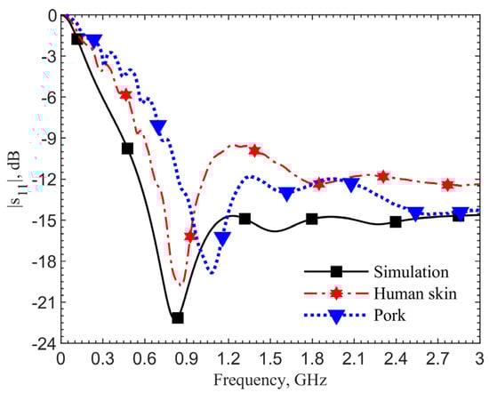 For further validation, we compare the scenario at the zero depth. The loop directly touches the skin. Figure 11 shows the results of the simulation utilizing the human skin electrical properties (black curve), measurement with the antenna placed on the skin of a person’s forearm (red), and on the top surface of the ground pork cube (blue). The resonant frequency in the simulation is 0.82 GHz, which matches the measured 0.86 GHz on the arm’s skin. The resonant frequency is 1.08 GHz for the ground pork phantom. The frequency difference of 220 MHz between the human skin and pork also agrees with those in other depths. From these two validation results, the designs utilizing the human skin properties could work well in realistic scenarios.
