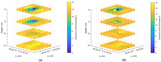 The subcutaneous implant is typically located in the hypodermics layer, and the depth is within 6 mm. In practical scenarios, the implant can be deeper. The results of mapping for an implant depth of 6, 9, 12 and 15 mm are shown in Figure 14a. Figure 14b compares the cases for orthogonal port orientation. The scanning image becomes noisy and less distinguished at 12 and 15 mm, compared to the 6- and 9-mm cases. It is obvious that when the port orientations are the same, the coupling is the strongest so the pixel differences are more distinct, comparing the same depths in Figure 14a,b. When the misalignment becomes greater, in addition to resonant frequencies becoming closer to the one without implant underneath, the frequencies fluctuate across pixels. Again, this is due to the 3-D field distributions of the tuned loop antennas in the tissues. As the implant is deeper, its fields spread out to more pixels, and the transmitter can still have some coupling effects on the implant.