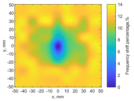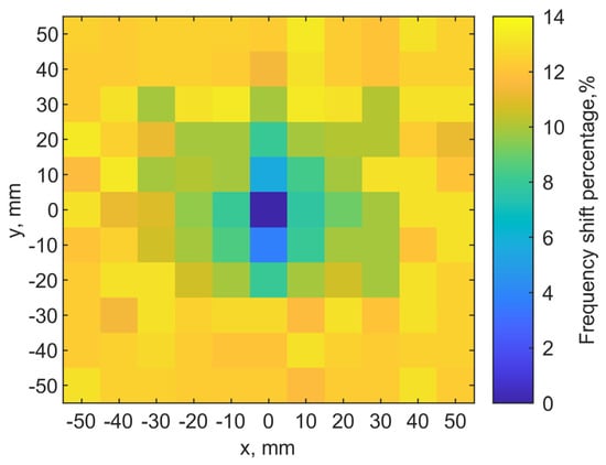 Figure 13a shows the scanning results. The color scales show the resonant frequency shifts from the designed one. It clearly shows the location of the implant antenna at (0, 0), where the resonant frequency of the transmitter is 906 MHz. Adjacent pixels (0, 10) (0, −10) have 960 and 940 MHz on the y-axis, respectively. At the edges of the map, its resonant frequencies are around 1.02 GHz.