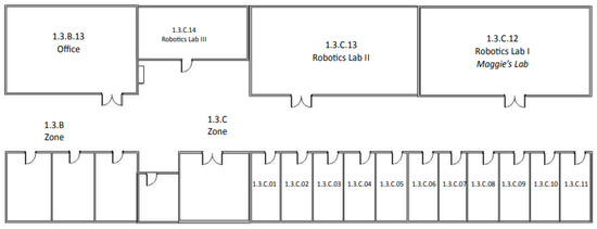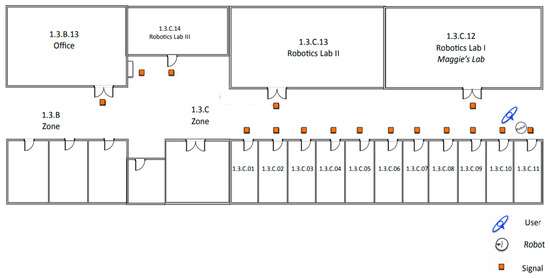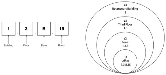 The signal representation is based in the usually found in public buildings [69,70]. In Spain, most of the public buildings use a classification based on zones. In order to facilitate the identification and the relationship among places, as a general rule, each zone has an alphanumeric identification (Figure 3).